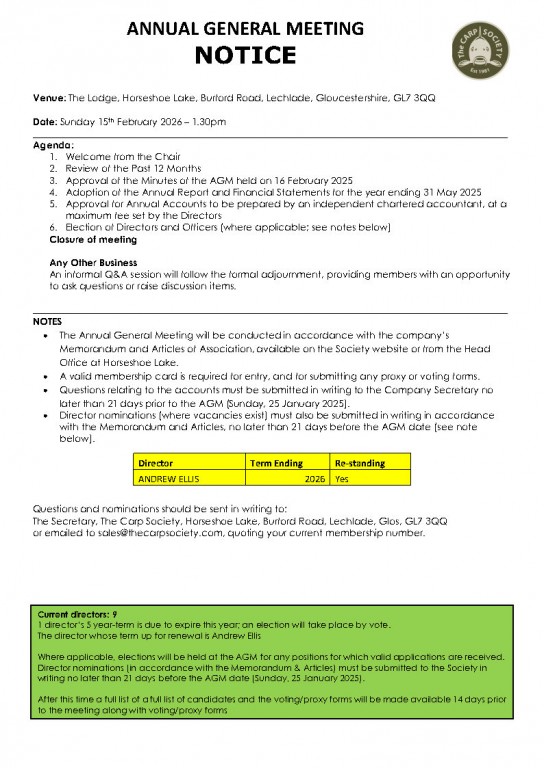 THE ANNUAL GENERAL MEETING (THE “MEETING”) OF THE CARP SOCIETY (THE “COMPANY”), WILL BE HELD AT HORSESHOE LAKE, BURFORD ROAD, LECHLADE, GLOUCESTERSHIRE GL7 3QQ ON SUNDAY 15th FEBRUARY 2026 AT 1.30PM TO TRANSACT THE FOLLOWING BUSINESS AS SHOWN ON THE AGENDA
